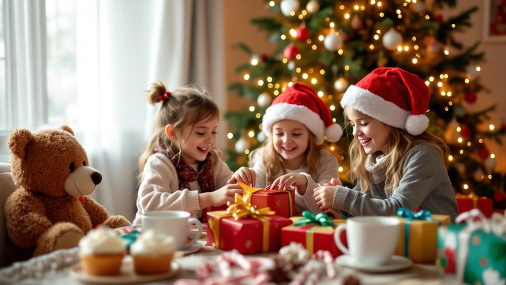 To host a magical Christmas party for children, focus on creating a festive atmosphere with twinkling lights and cheerful decorations. Offer kid-friendly foods like festive-shaped cookies, mini sandwiches, and fruit platters. Serve non-alcoholic holiday drinks such as hot chocolate and apple cider. Plan fun activities like cookie decorating, holiday-themed crafts, and age-appropriate games. Choose gifts that encourage creativity and imagination, like art supplies or personalized keepsakes. Guarantee safety by using non-toxic materials, avoiding choking hazards, and providing adult supervision. With these elements in place, you'll create unforgettable memories for your little guests. Explore more ways to make your children's Christmas party truly special.