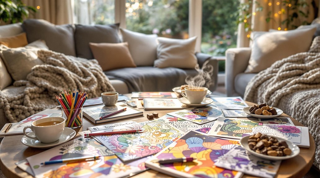 Although traditional parties can be overwhelming for introverts, organizing a relaxing coloring party offers a creative and calming alternative. A coloring party promotes relaxation and lets you engage in a creative activity while socializing at your own pace. Improve the theme by providing markers, colored pencils, and gel pens, along with colorful snacks and drinks. Encourage guests to bring their own coloring books or pages, and offer unique designs to suit different artistic preferences and skill levels. Sharing completed artwork fosters group interaction without the pressure of typical small talk. Guarantee comfortable seating and quiet spaces to accommodate introverted preferences, creating an enjoyable and inviting environment.