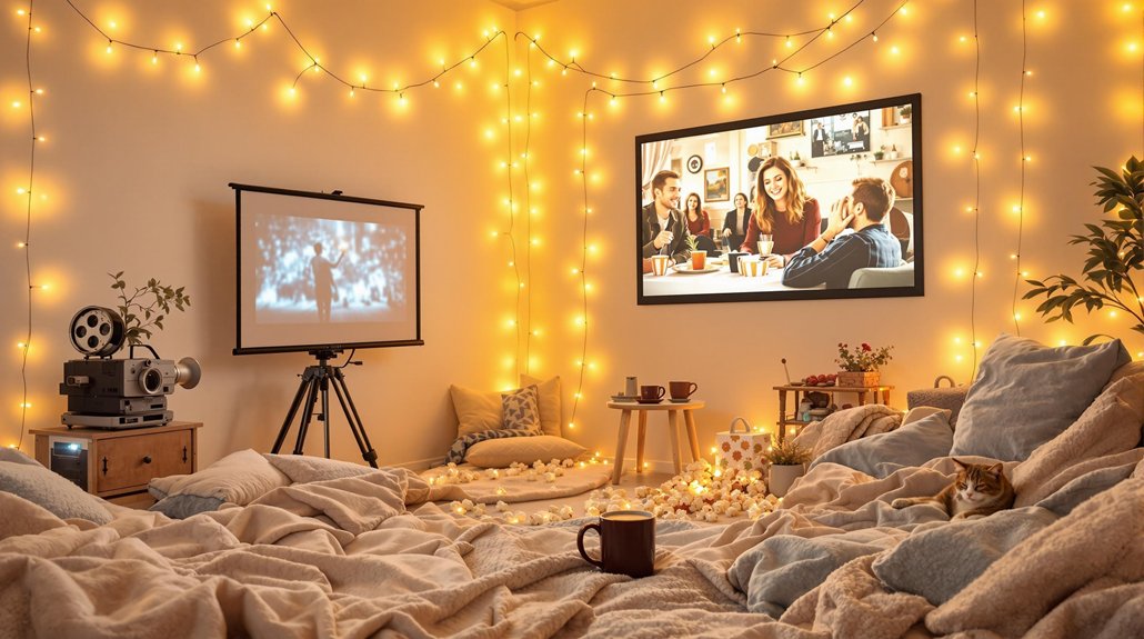 When planning a cozy movie marathon, consider how this setup can cater perfectly to introverts seeking a relaxed social experience. Start by creating a comfortable viewing area with soft seating, blankets, and dim lighting to set a warm atmosphere. This cozy environment allows introverts to enjoy the movie night without the pressure of constant conversation. Offer a variety of snacks like popcorn and candy, letting guests indulge with minimal social interaction during films.