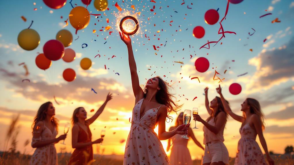 At a Freedom Celebration, you'll engage in activities that symbolize shedding constraints and embracing a fresh start. You might burn old documents or bury your wedding ring, signifying your commitment to new beginnings. Your guests will share strengthening stories and advice, helping you reclaim your identity and envision a brighter future.